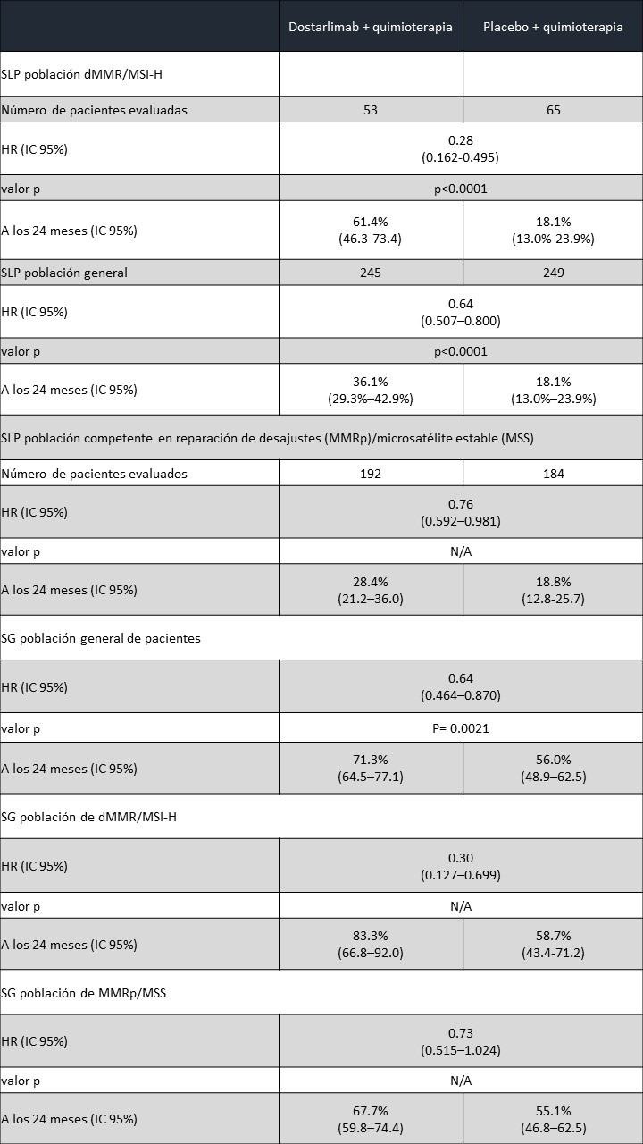 El estudio demostró que dostarlimab + carboplatino-paclitaxel mejoró estadística y clínicamente la SLP en pacientes con dMMR/MSI-H (n=118) y en la población general (n=494) vs. placebo + QT.